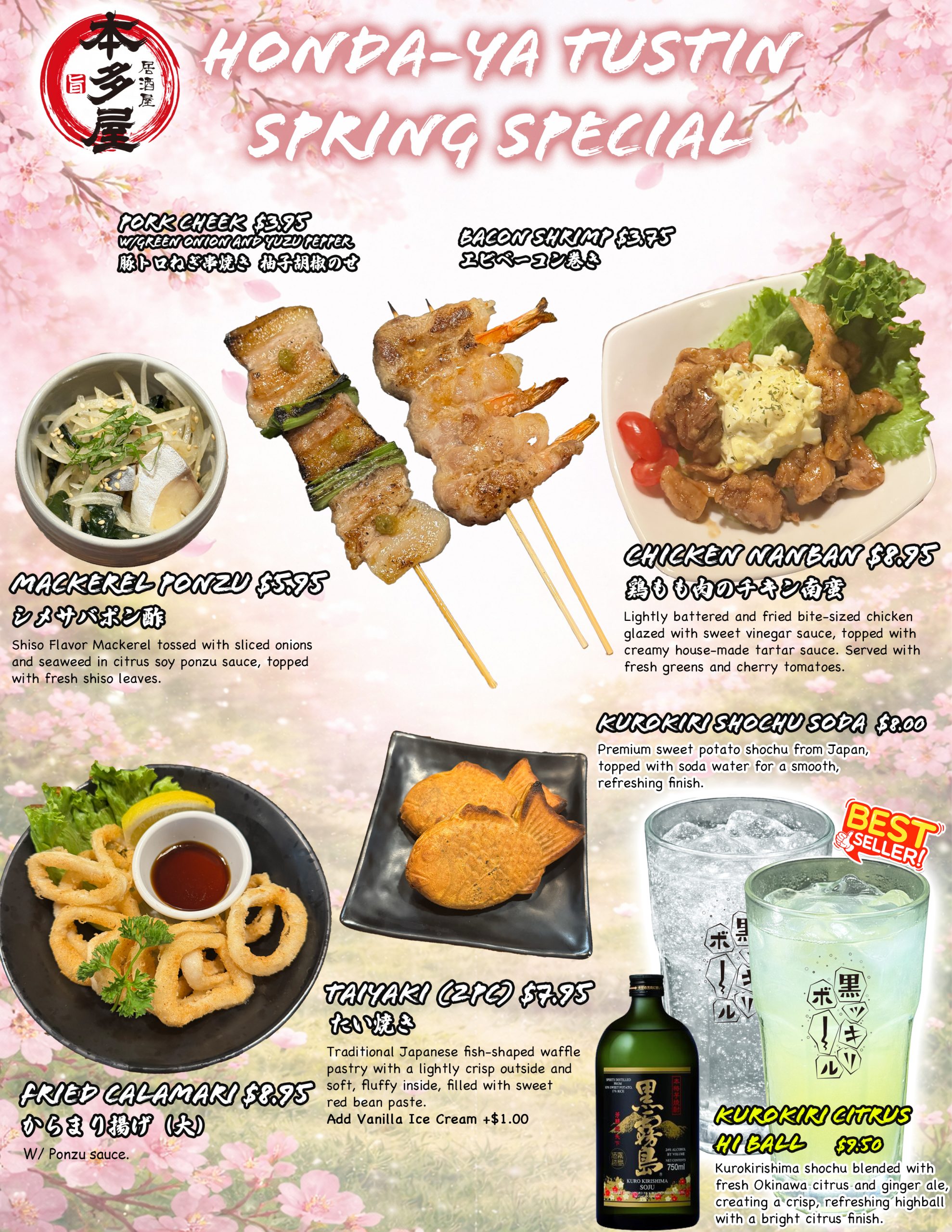TUSTIN Special Menu TUSTIN Truffle Fes TUSTIN Octopus Chili Salad Kappo Truffle Fes Winter Kurokirishima Menu Event Schedule HONDA-YA BEER commercial SEAN RABBITT (Team USA Figure Skater) Welcome to HONDA-YA Please enjoy the original Japanese style. We strive to be a restaurant that takes pride in meeting our customer’s expectations. Check TUSTIN Location ONLINE ORDER Check FOUNTAIN VALLEY Location ONLINE ORDER